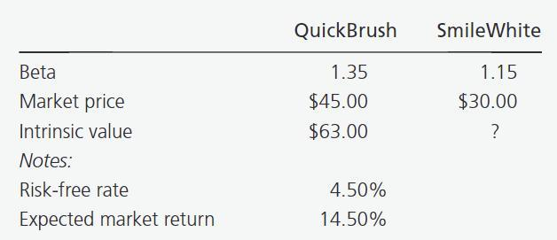 The risk-free rate and expected market return are provided in the table, and the beta for SmileWhite is given as 1.15.