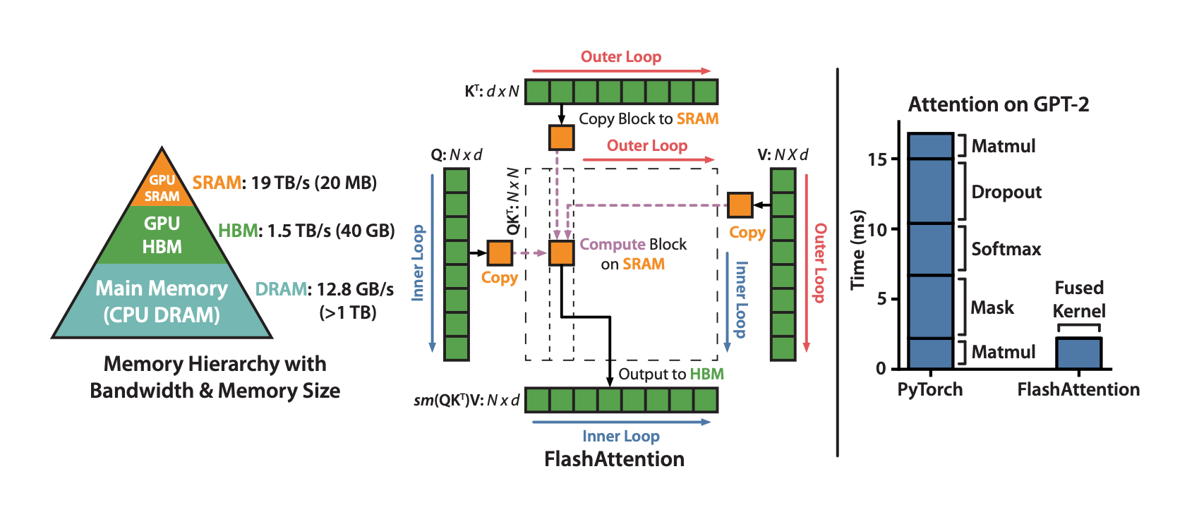For each attention head, to reduce memory reads/writes, FlashAttention uses classical tiling techniques to load blocks of query, key, and value from GPU HBM (its main memory) to SRAM (its fast cache), compute attention with respect to that block, and write back the output to HBM. This reduction in memory reads/writes brings significant speedup (2-4x) in most cases.
