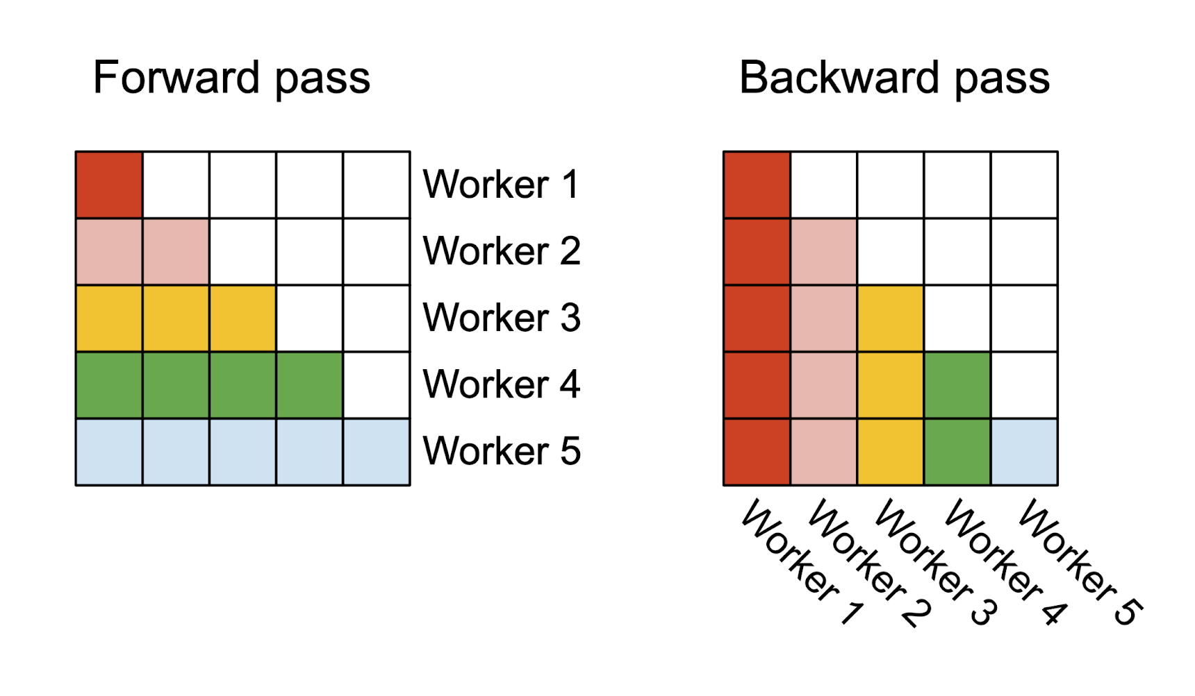 Image caption: In the forward pass, we parallelize the workers (thread blocks) where each worker takes care of a block of rows of the attention matrix. In the backward pass, each worker takes care of a block of rows of the attention matrix.