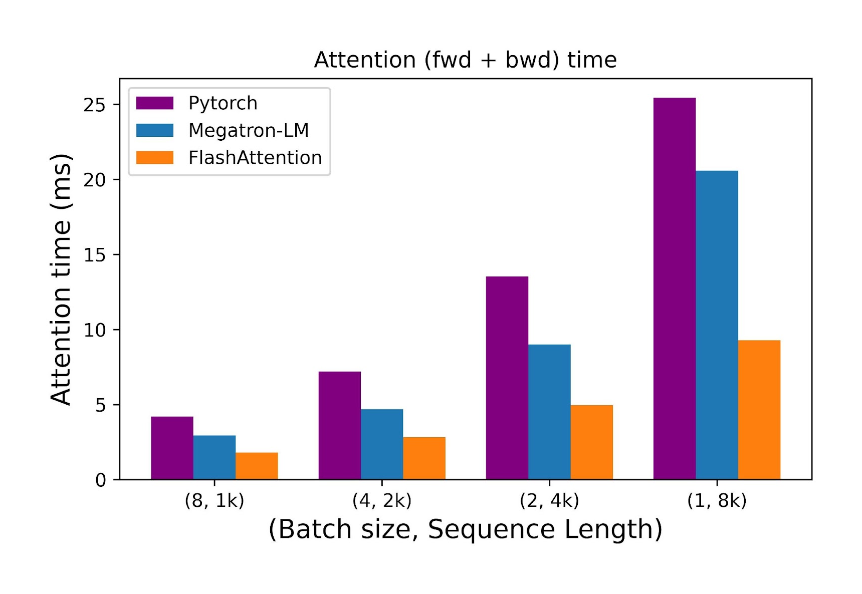Attention layer benchmark: We compare here the time taken by the forward + backward pass, as we increase the sequence length (and decrease the batch size to keep the total number of tokens the same). We keep the number of heads at 12 and head dimension at 128. Time is measured on an A100 40GB GPU. Compared to Pytorch and Megatron-LM attention implementations, FlashAttention is between 2.2x and 2.7x faster for longer sequences (8k).