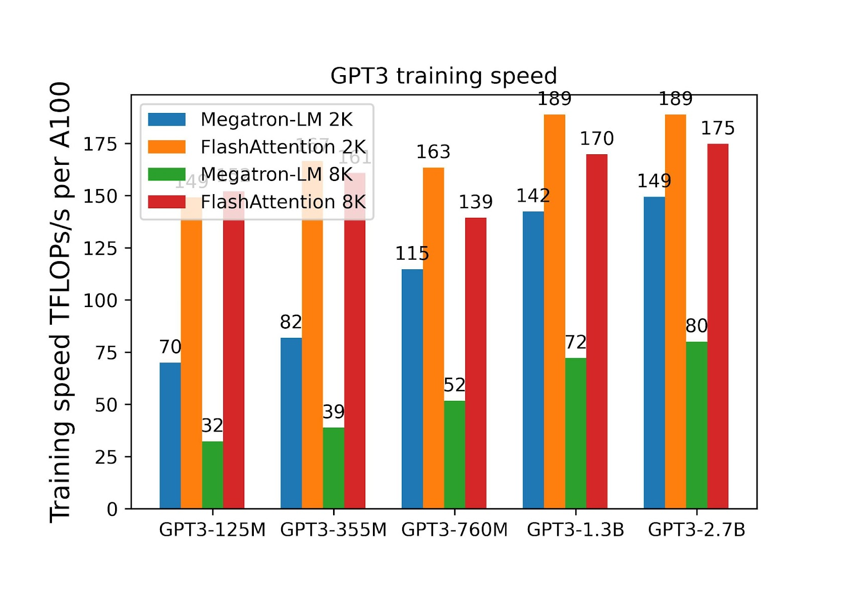 End-to-end training benchmark: when we use FlashAttention to train Transformers of size up to 2.7B on sequences of length 8k, we achieve a training efficiency of up to 175 TFLOPs/sec per A100 (equivalent to model FLOPs efficiency of 56%, we don’t need to do any activation checkpointing). This is 2.2 times faster than Megatron-LM, as shown in the figure below. Moreover, training with 8k context length with FlashAttention is only 7% less hardware efficient than training with 2k context length, as compared to Megatron-LM where increasing context length from 2k to 8k drops hardware efficiency by 1.9x. FlashAttention has made it much easier to train on long sequences.