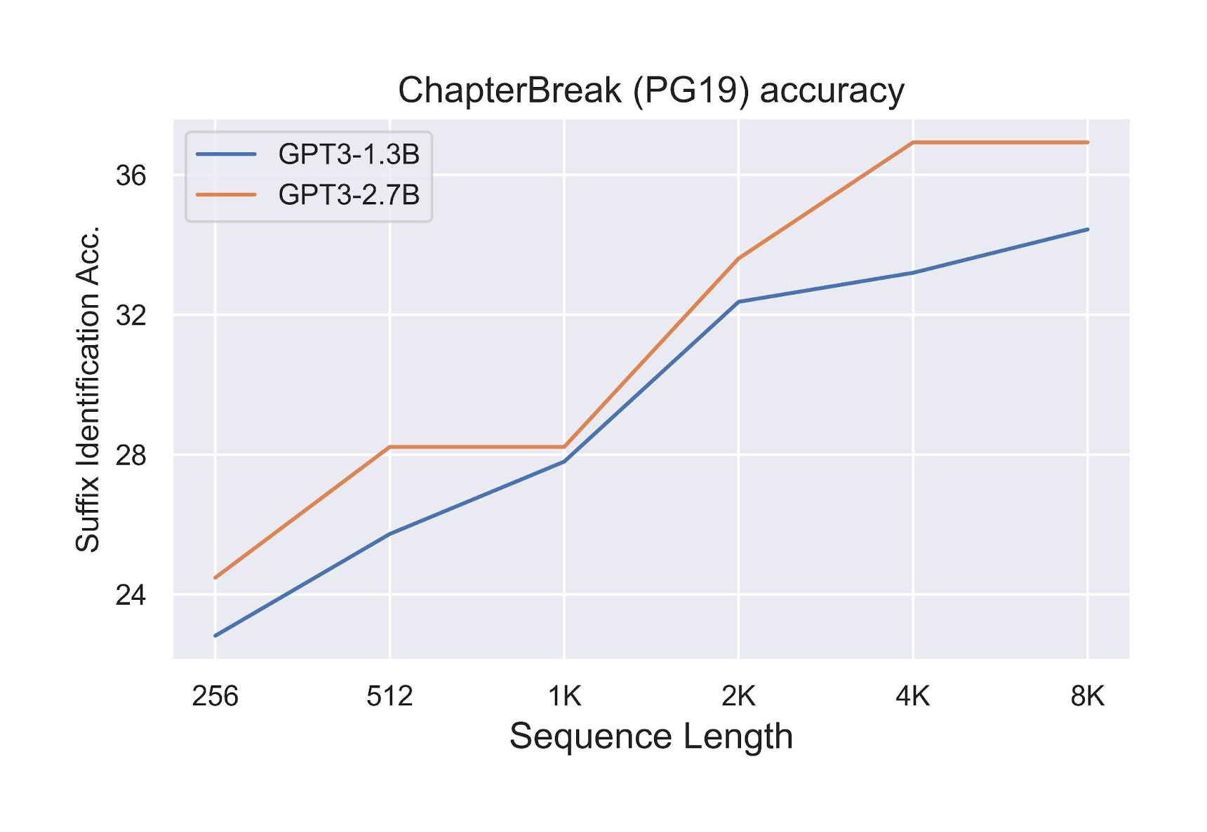 We evaluate these models on the ChapterBreak dataset (a challenge dataset for long-range language models where one is supposed to distinguish the right text that follows a chapter break). As one increases the context length, the accuracy of the models increases.